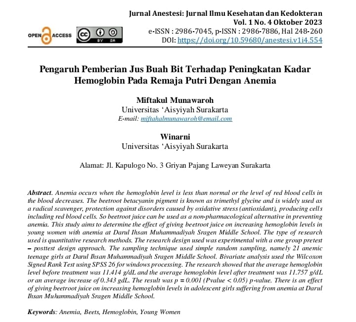 Pengaruh Pemberian Jus Buah Bit Terhadap Peningkatan Kadar Hemoglobin Pada Remaja Putri Dengan Anemi..